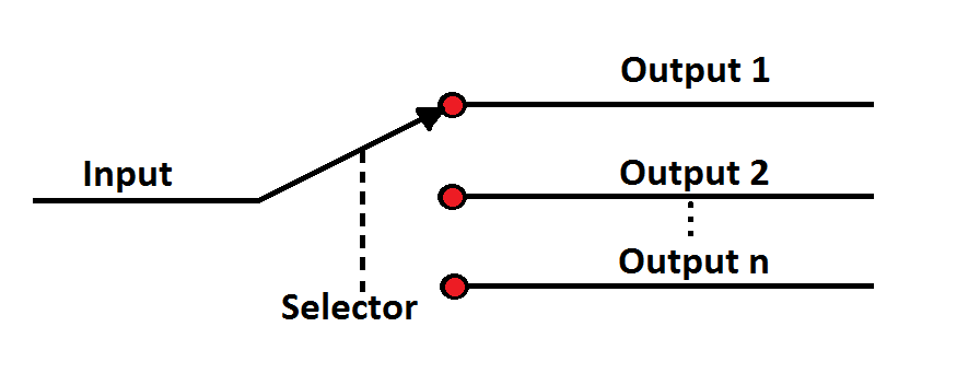 A demux (or demultiplexer) is a device taking a single input signal and selecting one of many data-output-lines, which is connected to the single input. The sum of all output port sizes must be equal to the input port size. Implementation class is CDemux.